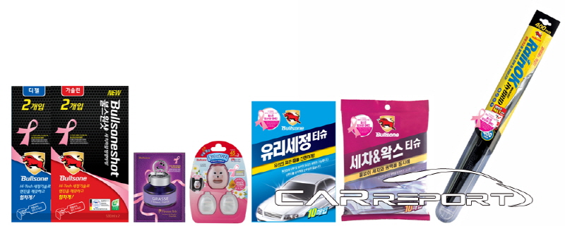 불스원 핑크리본 한정판 제품은 자동차의 심장인 엔진을 언제나 새 차처럼 쌩쌩하게 만들어주는 ‘불스원샷(가솔린용/디젤용)’, 4개의 관절구조로 자동차 전면유리에 강력히 밀착해 물방울을 완벽히 제거하는 ‘레인OK 하이브리드 와이퍼’, 향기로운 드라이빙을 위한 ‘그라스 레스떼렐 피렌체 아이리스’와 ‘폴라패밀리 통풍구형 방향제 샤샤(플로럴향)’, 자동차 도장면 및 유리를 손쉽게 닦을 수 있는 ‘불스원 유리세정티슈’와 ‘불스원 세차&왁스티슈’ 등 총 6종류가 출시된다. 불스원은 핑크리본 한정판 제품 패키지에 핑크리본 심볼을 활용해 핑크리본 한정판 제품임을 쉽게 알아볼 수 있도록 하였다. 또한 제품 수익 중 일부를 한국유방건강재단에 기부한다는 내용을 패키지에 담아 제품을 구입하면 소비자가 함께 ‘핑크리본 캠페인’에 동참할 수 있다는 메시지를 확인할 수 있도록 디자인했다. 한정판 제품은 9월 4째주부터 대형 마트에서 구매할 수 있다. 이들 제품의 판매 수익금 일부는 한국유방건강재단에 기부되어, 여성의 건강을 위한 핑크리본 캠페인에 후원될 예정이며, 불스원은 핑크리본 캠페인 참여를 위해 지난 7월 1일 한국유방건강재단과 협약을 체결한 바 있다.