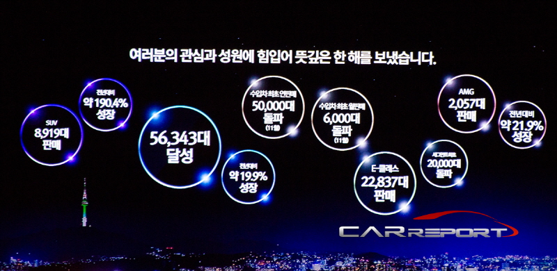 메르세데스-벤츠 코리아는 2016년 전년 대비 19.9% 상승한 총 56,343 대를 판매하며(KAIDA 한국수입자동차협회 발표 기준), 두 자릿수 성장의 목표를 달성했다고 밝혔다. 지난 11월에 일찌감치 국내 수입차 업계 최초로 연 5만 대 판매를 달성하면서 수입차 1위 자리를 확정 지은 것은 물론, 메르세데스-벤츠 승용 부문의 글로벌 성장률(11.3%)을 크게 상회하면서 11년 만에 메르세데스-벤츠가 글로벌 베스트셀링 브랜드로 올라서는 데도 중요한 역할을 했다.