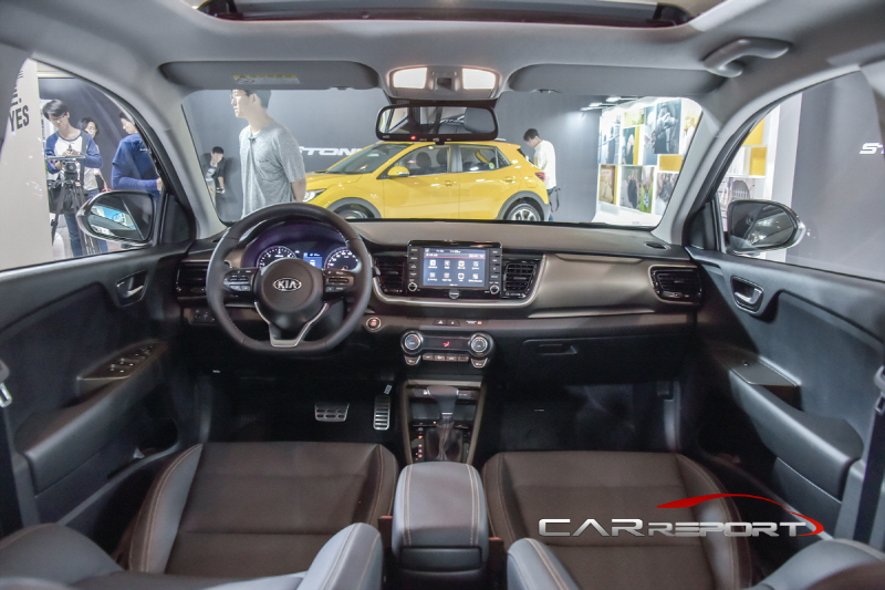 실내공간은 수평형의 레이아웃을 기반으로 넓은 공간감을 구현했고, 입체적이면서도 스포티한 감각의 디자인을 적용해 SUV 본연의 강인함과 활동성울 높였다. 센터페시아는 상하는 물론 운전석과 조수석을 과감하게 섹션을 분할하고 간결화했으며, 센터 에어벤트 상단 및 가니쉬에 컬러 포인트를 적용해 스토닉만의 젊고 특별한 감각을 살렸다.