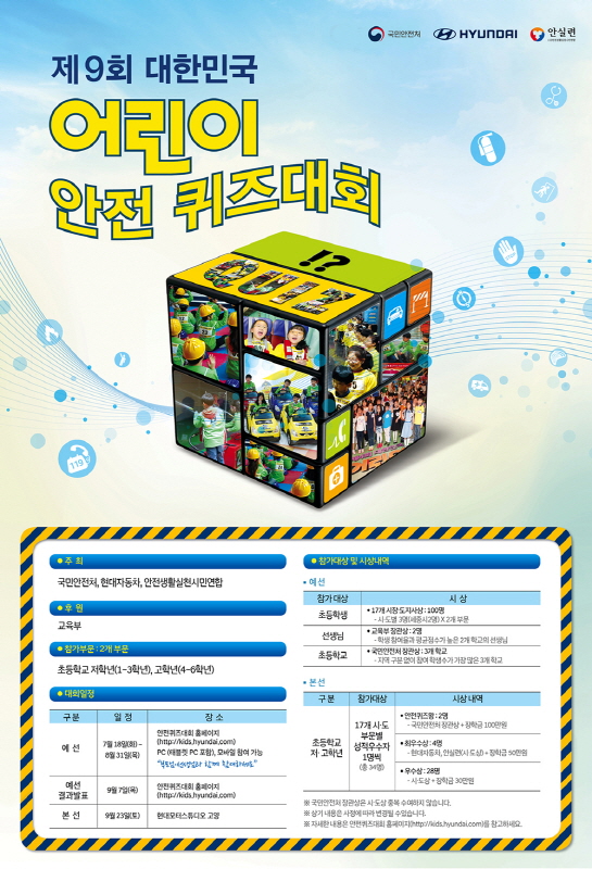 [TV리포트(카리포트)=김혜인 기자] 현대자동차는 국민안전처, 안전생활실천시민연합과 공동으로 어린이, 학부모, 교사가 함께 참여하는 ‘제9회 대한민국 어린이 안전 퀴즈대회’를 7월 18일부터 개최한다고 밝혔다.
