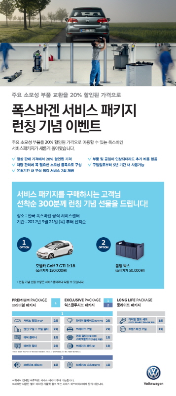 이와 함께 폭스바겐코리아는 서비스 패키지 출시를 기념하여 구매 고객을 대상으로 폭스바겐 순정 액세서리를 선착순 300명에게 증정하는 이벤트를 진행한다(선물 품목 및 수량은 서비스센터 별로 상이).