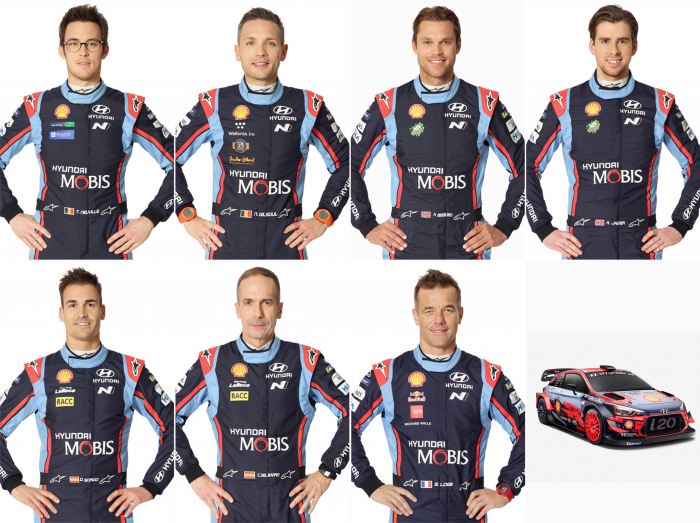 2019 WRC 출전 현대 월드랠리팀 드라이버 라인업. 1열(좌로부터) ‘티에리 누빌(Thierry Neuville)’, ‘니콜라스 질술(Nicolas Gilsoul)’, ‘안드레아스 미켈슨(Andreas Mikkelsen)’와 ‘앤더스 예거(Anders Jæger)’. 2열(좌로부터) ‘다니 소르도(Dani Sordo)’와 ‘칼로스 델 바리오(Carlos del Barrio)’, ‘세바스티앙 롭(Sebastien Loeb)’