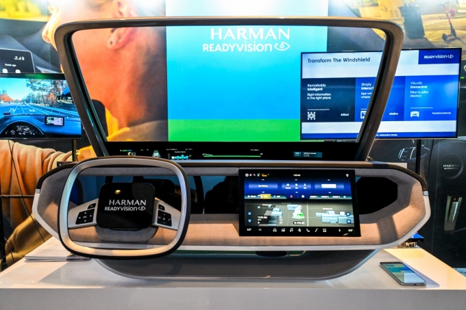 업계에서 인정받은 수상 경력을 가진 윈드쉴드 기반의 반사형 디스플레이 하만의 레디 비전 큐뷰(Ready Vision QVUE)는 5,000니트의 밝기, 모듈식 디자인, 2025년형 윈드쉴드 전체 확장성을 특징으로 차량 내 넓은 시야각 경험을 제공하는 제품이다.