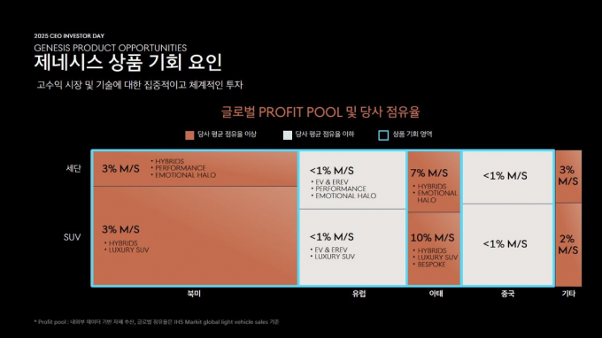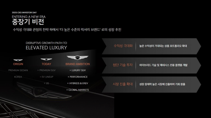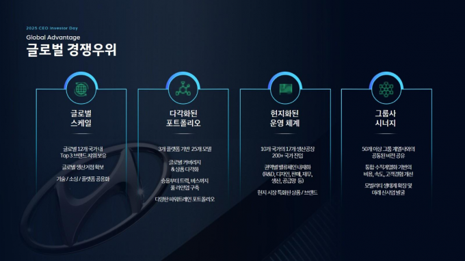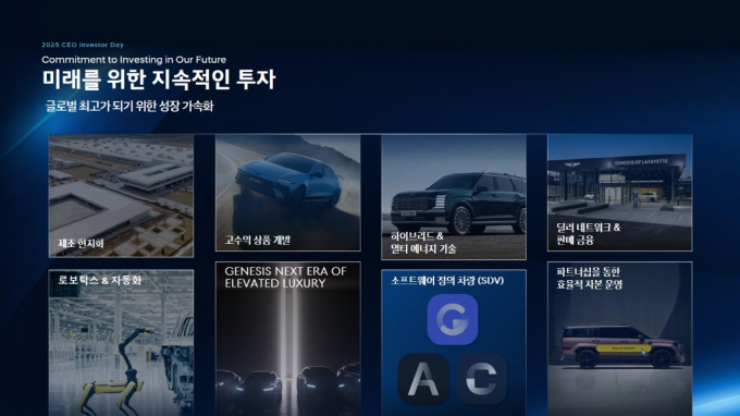 한편, 현대차는 연결 부문 영업이익률 목표를 ▲2025년 6~7% ▲2027년 7~8% ▲2030년 8~9%로 설정했다. 하이브리드 및 제네시스 중심 판매 믹스 개선, 지속적인 현지 생산 및 소싱 최적화 등 현지화 전략, 하이브리드 및 EV, SDV 원가 경쟁력 강화 등으로 지속적으로 수익성 개선을 추진한다는 계획이다.