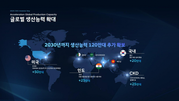 이밖에 현대차는 주요 신흥 시장에서 현지 파트너와 협력해 CKD(Complete Knock Down·반조립제품) 생산 거점도 확장하며 25만대 이상의 생산능력을 추가로 확보한다. 대표적으로 현대차와 사우디아라비아 국부펀드(PIF)와 협력하는 중동 지역 최초의 현대차 생산기지 사우디아라비아 생산법인(HMMME)은 연간 5만대 규모로 2026년 4분기 가동을 시작한다.