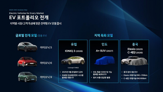 현대차는 글로벌 경쟁력을 인정받은 아이오닉 5, 아이오닉 6, 아이오닉 9 등 E-GMP 전용전기차의 성공 경험을 바탕으로 현지 특화 상품성을 갖춘 신형 전기차들을 유럽, 중국, 인도 시장에 순차적으로 선보이며 캐즘 극복을 적극 추진할 계획이다.
