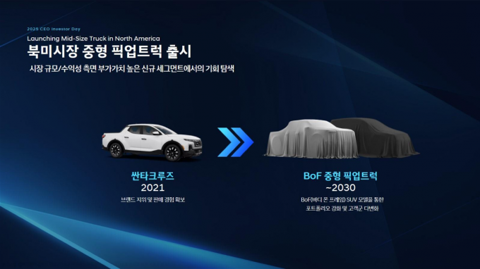 현대차는 픽업트럭, 상용차 등 북미 시장을 공략할 다양한 도전도 계속해 이어 간다. 현대차는 2021년 출시한 북미 전용 준중형 픽업트럭 ‘싼타크루즈’의 성공을 이을 중형(Midsize) 픽업트럭을 2030년 이전까지 현지 시장에 선보이기로 했다.