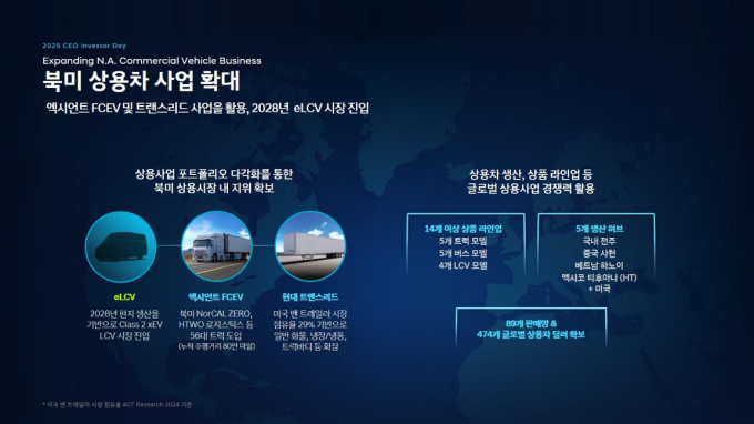 또한 현대차는 엑시언트 수소전기트럭과 트레일러 법인 현대트랜스리드(Hyundai Translead)의 우수한 트레일러 상품, 이르면 2028년 미국 현지 생산이 시작되는 전기 상용 밴 등을 앞세워 북미 상용차 시장 공략을 강화해 나갈 계획이다.