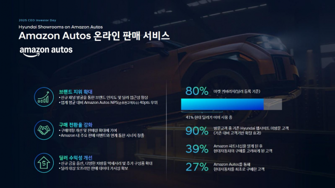 아울러 현대차는 미국 최대 전자상거래 플랫폼 아마존을 통해 자동차 판매도 적극진행 중이다. 미국 내 현대 딜러 41%가 아마존 오토스(Amazon Autos)에 자리잡아 차량을 판매하고 있으며, 향후 추가 딜러 참여도 기대된다. 기존 현대차 웹사이트에 방문하지 않았던 소비자도 아마존 오토스에서 현대차 차량을 살펴봤으며, 아마존 오토스에서 차량을 구입한 일부 고객은 이전에는 현대차를 경험해본 적이 없었던 신규 소비자인 것으로 나타났다.