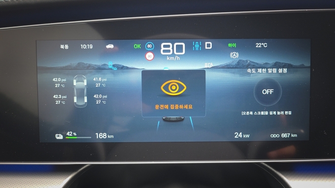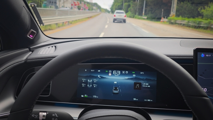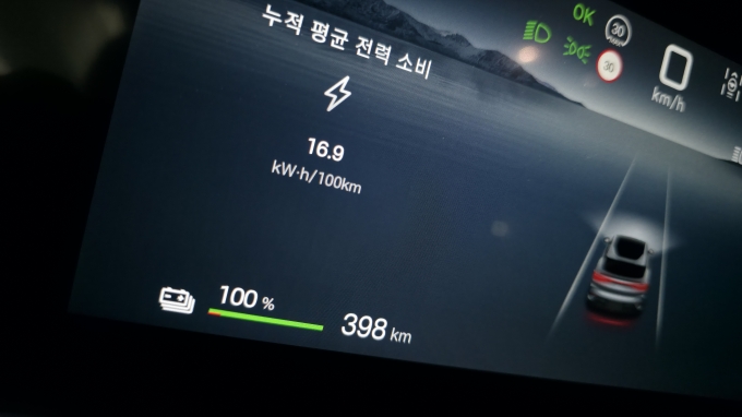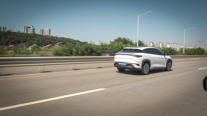 쭉 뻗은 직선 구간에서 가속 페달을 깊게 밟자, 후륜구동 313마력(230kW)의 힘으로 속도계 수치를 거침없이 상승시키며 운전자를 등받이에 밀착시켰습니다. 제원상 복합전비 4.3㎞/kWh, 1회 충전 시 총 주행 거리 398Km라는 수치는 실제 주행에서 경험한 여유로운 효율성과도 완벽하게 일치했습니다.