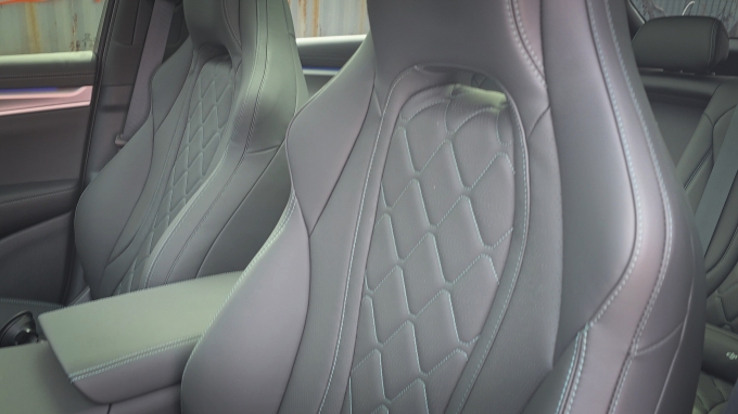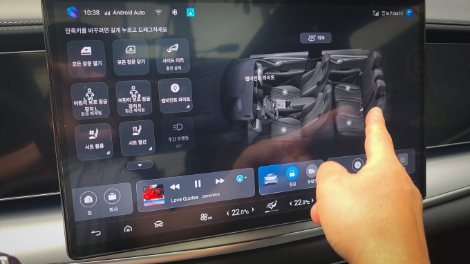 운전석에 앉아 시트 포지션을 조절하자 몸을 부드럽게 감싸는 인조가죽 시트의 착좌감은 매우 만족스러웠습니다. 손에 감기는 스티어링 휠의 그립감도 좋았고, 운전자 중심으로 깔끔하게 정돈된 대시보드는 시인성 또한 뛰어났습니다. 중앙에 자리한 15.6인치 디스플레이는 필요한 정보를 한눈에 볼 수 있게 해주었으며, 내비게이션이나 인포테인먼트 기능을 직관적으로 조작할 수 있도록 돕습니다. 실제 조작해보니 터치 반응 속도도 빨라 불편함이 전혀 없었습니다.