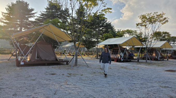 암정교를 건너 용양늪 트레킹을 하며 철원의 독특한 습지 생태계와 주변의 아름다운 자연경관에 절로 감탄했습니다. 하루의 라이딩을 마치고 도착한 유곡리 평화마을 캠핑장에는 텐트와 화로, 장작까지 완벽하게 준비되어 있었습니다.