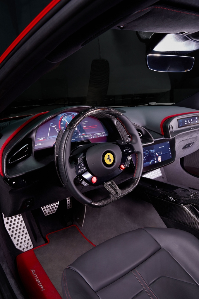 실내 디자인은 운전자와 동승자가 각자의 공간에 몰입할 수 있도록 설계된 '듀얼 콕핏' 콘셉트를 기반으로 합니다. 고객들의 피드백을 적극적으로 반영한 새로운 HMI(Human-Machine Interface) 시스템은 페라리의 철학인 "눈은 도로에, 손은 스티어링 휠에(Eyes on the road, hands on the wheel)"를 완벽하게 구현합니다.
