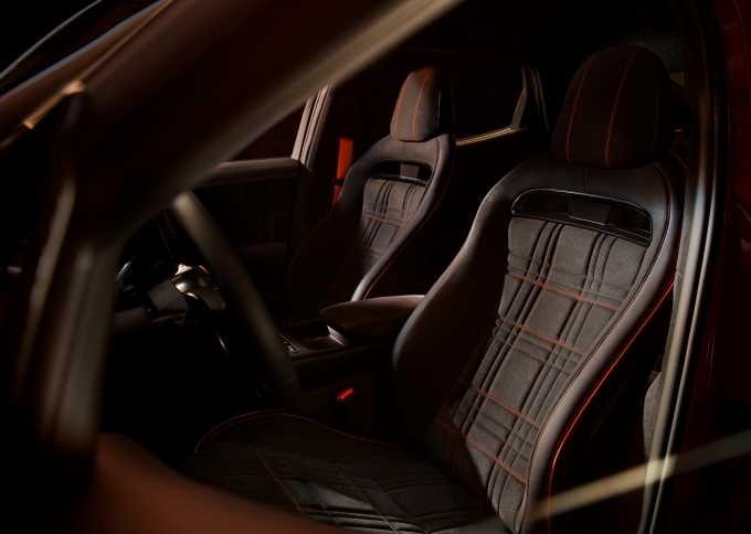 실내는 고급 소재와 스포티한 감각을 동시에 느낄 수 있도록 디자인되었습니다. 시트, 도어 트림, 센터 콘솔 등 주요 부위에는 스웨이드 계열의 샤무드 소재가 적용되었고, 내장 컬러에 따라 오렌지 및 그레이 스티치, 퀼팅, 시트벨트가 더해져 마그마만의 아이덴티티를 강조합니다. 스티어링 휠에는 원형 림, 블랙 엠블럼, 오렌지 드라이브 모드 버튼, 검은색 부스트 모드 버튼 등 전용 요소들이 차별화된 경험을 제공합니다.