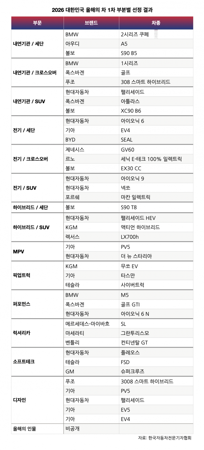 2026 대한민국 올해의 차는 대상인 ‘2026 대한민국 올해의 차’를 비롯해 △올해의 내연기관 세단 △올해의 내연기관 크로스오버 △올해의 내연기관 SUV △올해의 전기 세단 △올해의 전기 크로스오버 △올해의 전기 SUV △올해의 하이브리드 세단 △올해의 하이브리드 SUV △올해의 MPV △올해의 픽업트럭 △올해의 퍼포먼스 △올해의 럭셔리카 △올해의 소프트테크 △올해의 디자인 △올해의 인물 등 총 15개 부문에서 시상한다.