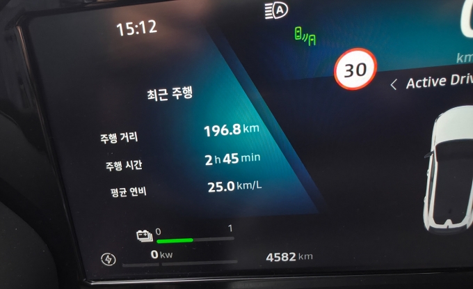 출근 시간, 정체로 가득한 도심에서 시작된 테스트는 꽤 가혹한 조건이었다. 가다 서다를 반복하는 흐름 속에서 23km를 달린 결과는 리터당 14.9km. 공인 복합연비 15.1km/L에 거의 근접한 수치다. 이 정도 덩치(약 1.8톤)에 E세그먼트 크로스오버라는 점을 감안하면, 이미 이 구간에서 ‘기술의 방향성’은 분명해진다. 도심 주행의 최대 75%까지 전기모드로 주행이 가능한 하이브리드 시스템이 실제 환경에서도 그대로 작동하고 있다는 의미다.
